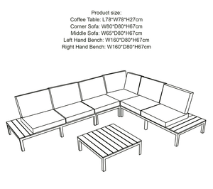 - Dimensions: Coffee Table: H: 27cm x W: 78cm x L: 78cm, Corner Sofa: H: 67cm x W: 80cm x L: 80cm, Mid Sofa: H: 67cm x W: 65cm x L: 80cm, Left & Right Bench: H: 67cm x W: 160cm x L: 80cm