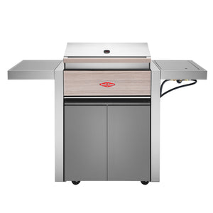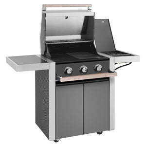 - Key Features: 3 stainless steel burners with a total output of 36 MJ/h (34,000 BTU/h), Main cooking area: 3,000 cm² (465 in²) and warming rack area: 1,000 cm² (155 in²), 1 side burner with a separate control and output of 10 MJ/h (9,500 BTU/h), Electronic ignition for easy start-up, Lockable wheels for stability and mobility