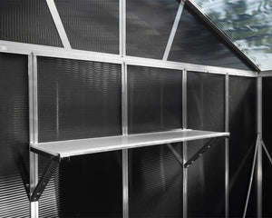 Optimize your storage space with this Utility shed shelf kit. This kit comes complete with 1 polycarbonate shelf, 2 aluminum profiles, 2 galvanized steel brackets, and hardware.