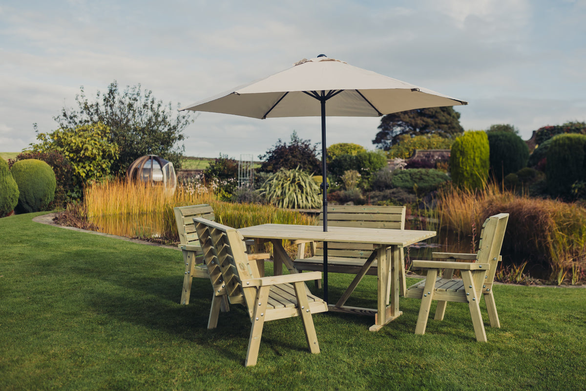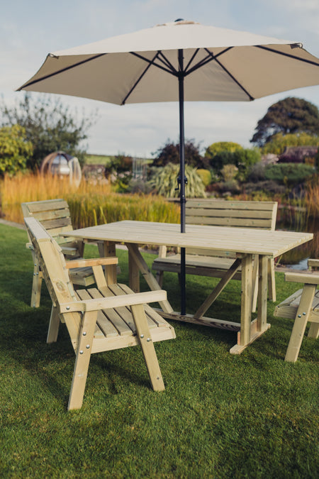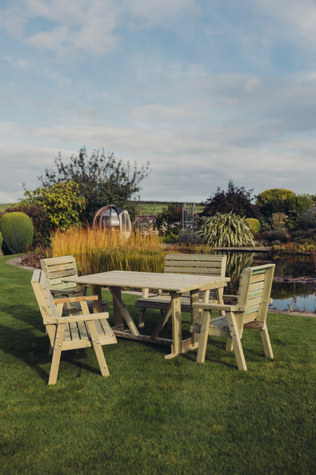 Crafted from high-quality, pressure-treated timber, this dining set is built to withstand the unpredictable British weather. The thick, solid legs of the table and the chunky design of the chairs and benches ensure exceptional stability and durability. Handmade in the UK, each piece is treated to resist rot and decay, promising years of reliable use. With a commitment to quality, this set is not only functional but also a beautiful addition to your garden.