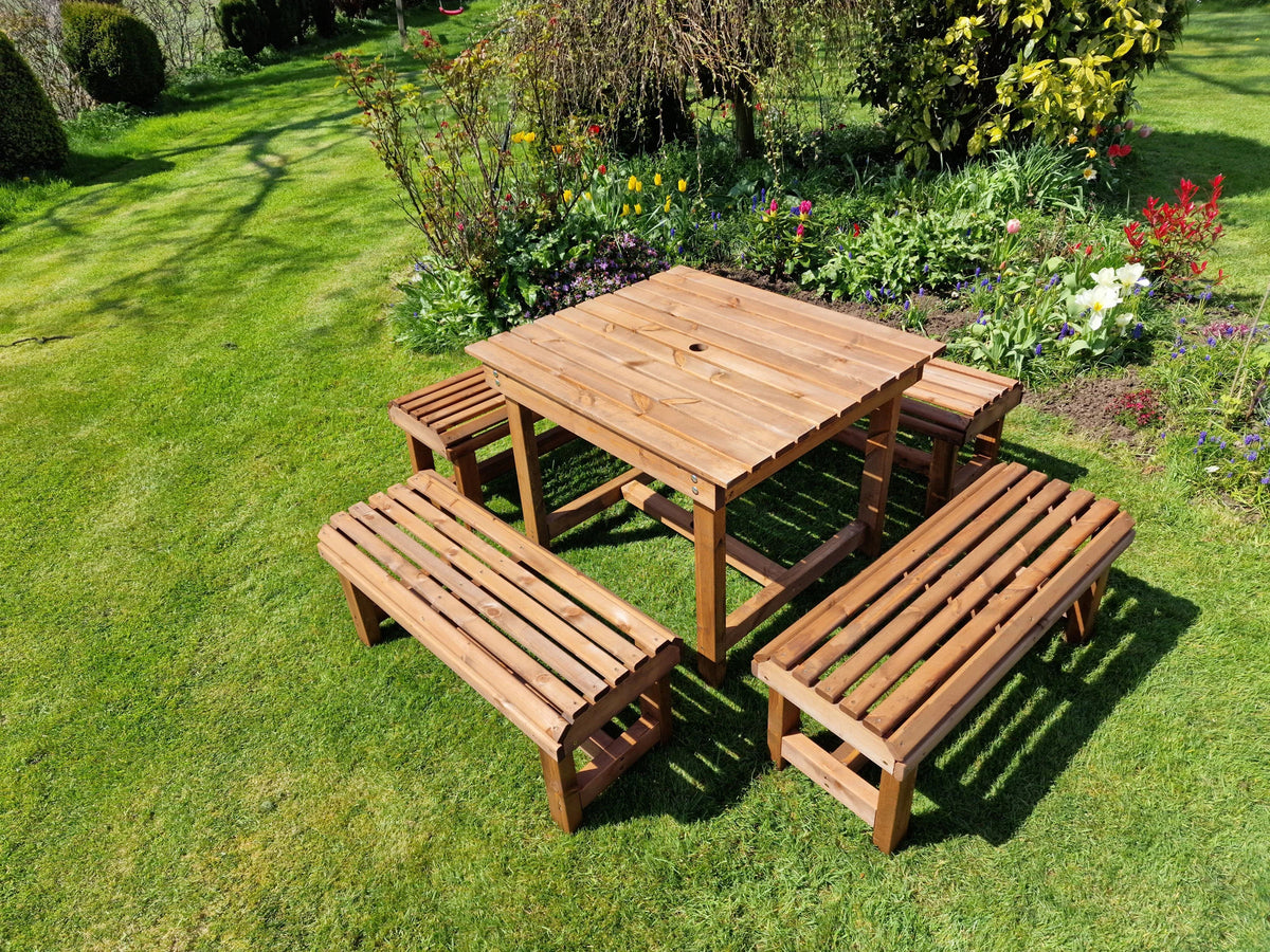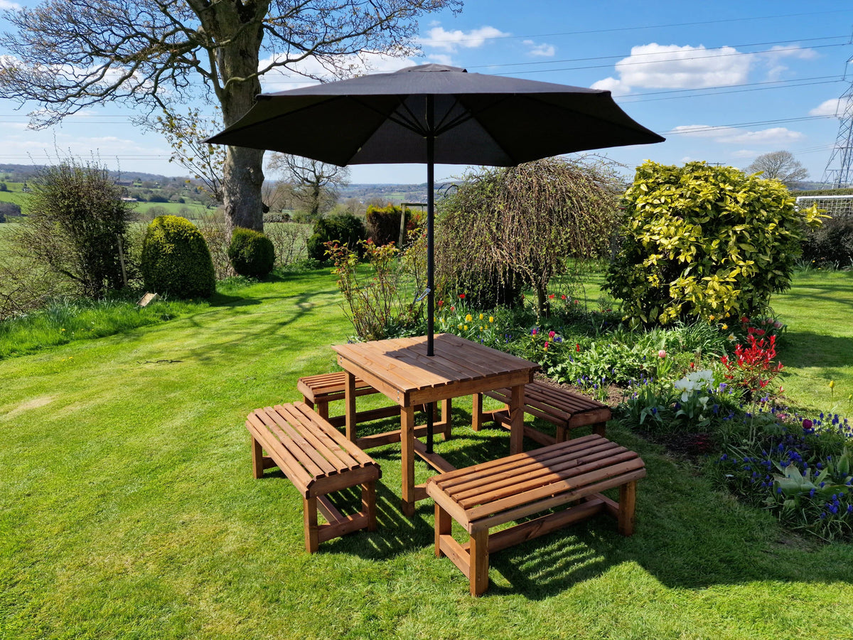 Designed for ease of use, this garden dining set is not only aesthetically pleasing but also practical. The chunky benches provide ample seating space, accommodating two to three people each, while the spacious table allows for easy access and movement. Maintenance is straightforward; simply re-treat the wood annually to keep it looking its best. With free delivery across the UK and a 30-day return policy, purchasing this set is a hassle-free experience.