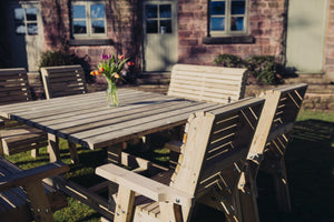 Crafted from premium quality, pressure-treated timber, this dining set is built to last. The thick, solid wood construction ensures durability and stability, while the tanalised finish protects against rot for up to 20 years. Each piece is handmade in the UK, reflecting a commitment to quality and craftsmanship. You can trust that this set will withstand the elements and provide years of enjoyment.