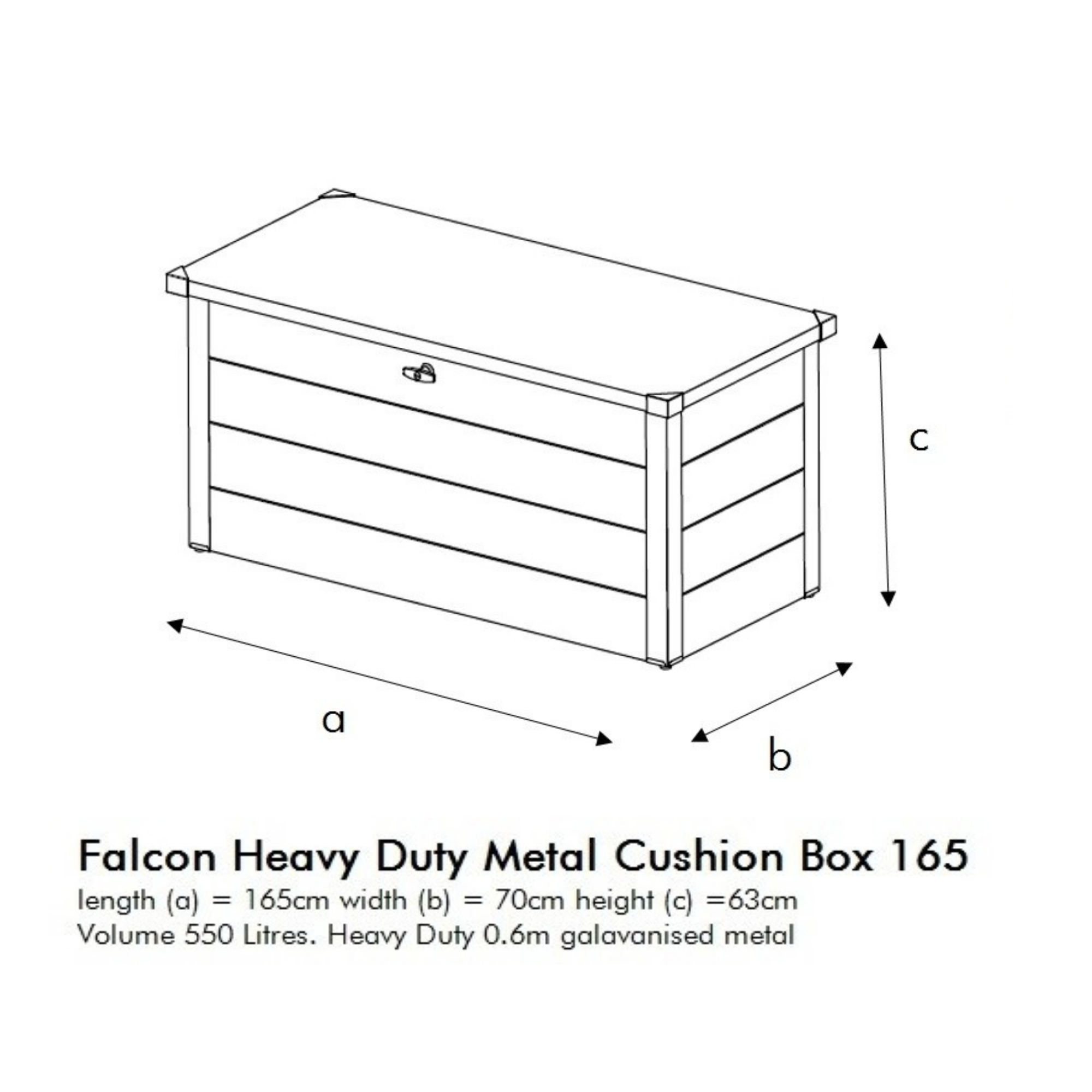 The Falcon Heavy Duty Storage Box is constructed from 0.6mm thick galvanized steel panels and boasts both a heavy-duty metal floor and stainless-steel fixings. This ensures that it will remain rust-free and provide long-term premium protection. As well as this, this outdoor storage box is fire-proof and completely maintenance-free, saving both time and money. Owner access is gained through a clever top-opening gas-strut-assisted lid, whilst a double-bolted key lock offers outstanding security for added peace of mind. Designed to be bolted onto a hard base, this metal storage box is going nowhere without the ownerβs permission. Suitable for storing a wide range of garden tools and equipment, the Falcon Cushion Storage Boxes come in a range of sizes complete with a 10-year manufacturer's non-perforation warranty. This type of metal box is growing in popularity amongst garden owners, it's strong, durable, weather resistant and perfect for storing your garden equipment, including kids' toys and other garden must haves. This garden storage box is ideal for sitting on as well, proving you with a great seating space alongside the vast amount of storage you're going to have available to you. Although easy to assemble, step-by-step instructions are included.