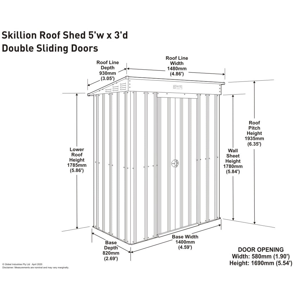 The Globel Pent fronted premium garden shed is a pent roof shed manufactured from high tensile, hot-dipped galvanized steel throughout. This product is the final result of two years of research and development by those who have been involved with light-clad metal sheds for many years. A combined effort between a factory with brand new steel roll forming equipment and a research team has now produced a shed which is stronger, more durable and easier to build but remains in a traditional color combination. This is development in light-clad metal sheds at the best value price. Globel sheds are perfect for caravan parks where non-combustible storage sheds are compulsory and will provide a rust-free, practical storage solution for a minimum warranty period of 15 years. These products are the highest specification lightweight metal garden sheds on the market. Apart from the high grade of 0.3mm steel and paint finish, they have ventilated gables and all standard buildings have the tallest wall height available. The frame and base rails are made from solid heavy gauge galvanized steel, the parts and their fixings are simple and straightforward to assemble. Each door, the door glide & track layout have been designed with strength and simplicity in mind. The door glide itself has been completely redesigned to provide a more stable and well-balanced door opening, providing you with a high-quality range of metal sheds. This Globel Pent metal shed is a secure metal storage shed, perfect for keeping your garden tools inside. The galvanized steel ensures the shed is weather resistant, meaning this metal building is extra strong. Since this she is available in a range of sizes too, you're bound to find a shed that fits your needs. A huge effort has gone into the preparation of the instruction manual to ensure that it is as ‘user friendly’ and as informative as possible. Our suppliers have sought input and advice from many trusted sources, enabling them to compile a manual which helps to ensure the assembly is more of a pleasure than a chore!! Nominal model sizes are based on the roof dimensions.