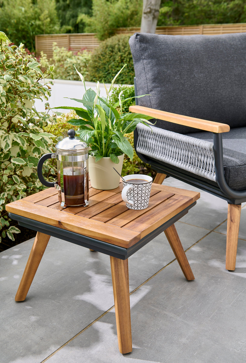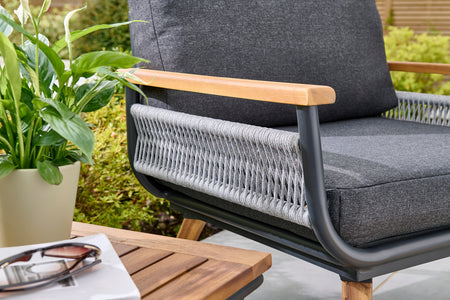 Crafted from durable powder-coated aluminium and FSC Acacia, the Kimora set is built to withstand the elements while maintaining its sleek appearance. The unique rope inset detailing adds a touch of sophistication, setting this bistro set apart from the rest. The thick, soft grey cushions are not only stylish but also shower-resistant and stain-protected, ensuring they remain pristine for years to come. Enjoy peace of mind knowing that this set is designed for long-term outdoor use.