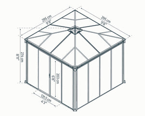 - Dimensions: Total Height: 276 cm (9 ft 1 in), Total Width: 295 cm (9 ft 8 in), Total Depth: 295 cm (9 ft 8 in), Height to Gutters: 210 cm (6 ft 11 in), Wall Height: 207 cm (6 ft 9 in), Door Width: 131.5 cm (4 ft 4 in)