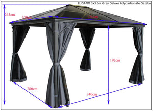 Lugano 3m x 3.6m Grey Aluminium Polycarbonate Gazebo & Pergola with Curtains