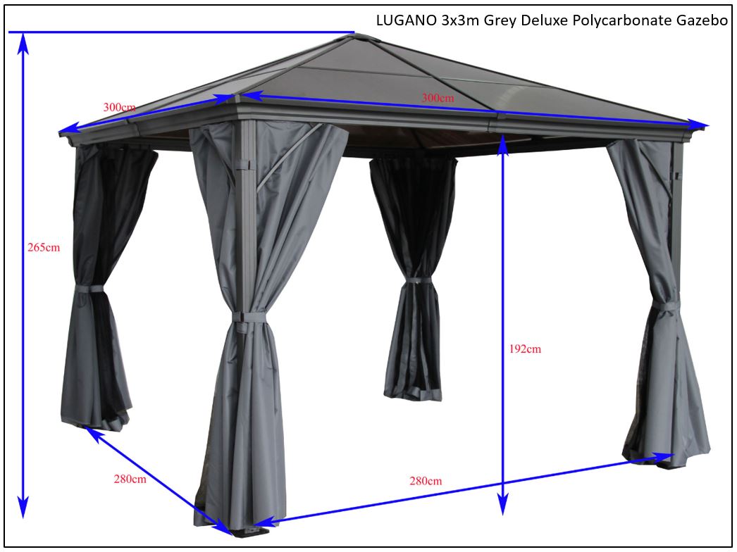 The Lugano gazebo is your go-to solution for creating a versatile outdoor space. Measuring 3m x 3m, it provides ample room for various activities, from family gatherings to intimate dinners. The combination of a sleek design and practical features makes it an essential addition to any garden or patio.