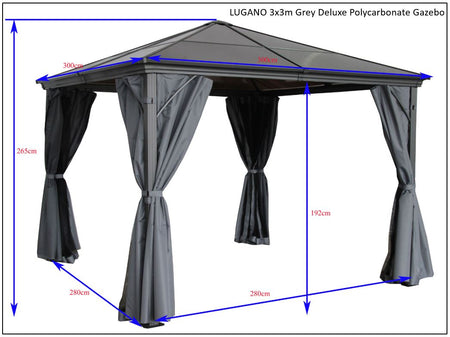 Transform your outdoor space with the Lugano 3m x 3m Grey Aluminium Polycarbonate Gazebo & Pergola with Curtains. This stylish and functional gazebo is designed to create a perfect outdoor retreat, whether you're hosting a summer barbecue, enjoying a quiet afternoon with a book, or entertaining friends under the stars. With its modern grey finish and elegant design, the Lugano gazebo seamlessly blends into any outdoor setting, making it a must-have for your garden.