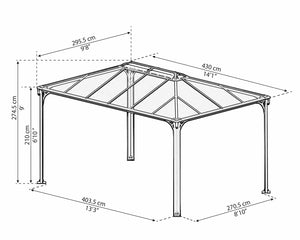 - Dimensions: External Width: 430cm (169.3ins), External Depth: 295cm (116.3ins), External Height: 274.5cm (108.1ins), Post Height: 210cm (82.7ins)