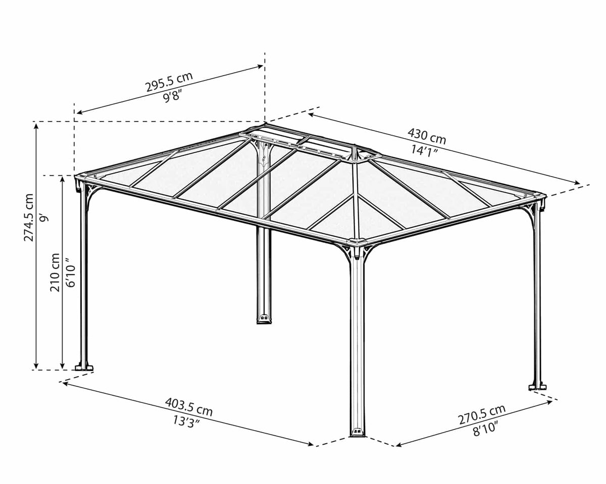 • Dimensions: External Width: 430cm (169.3ins), External Depth: 295cm (116.3ins), External Height: 274.5cm (108.1ins), Post Height: 210cm (82.7ins)