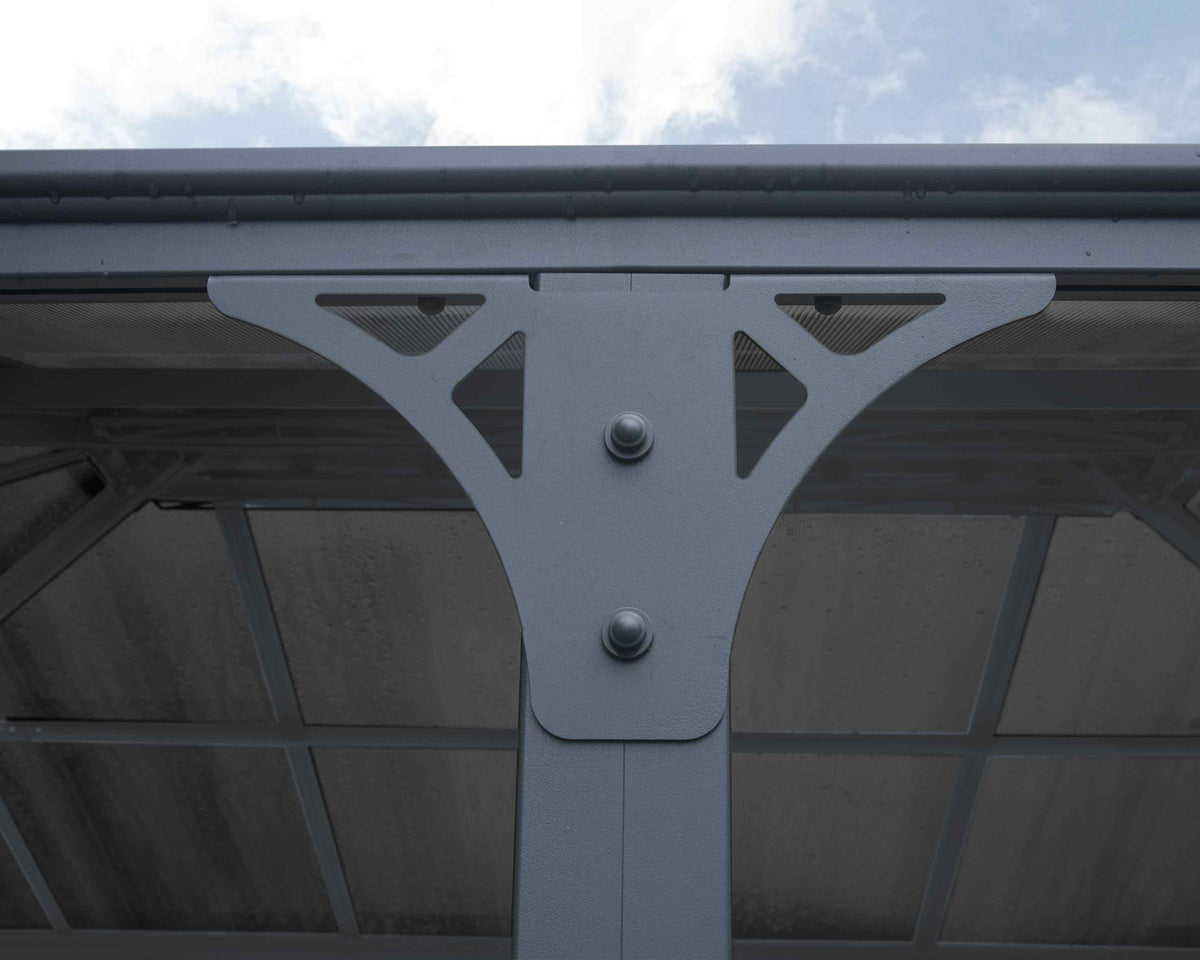 • Materials: Frame: Corrosion-resistant grey powder-coated aluminium, Roof: Virtually unbreakable 6mm twin-wall polycarbonate panels, UV protected
