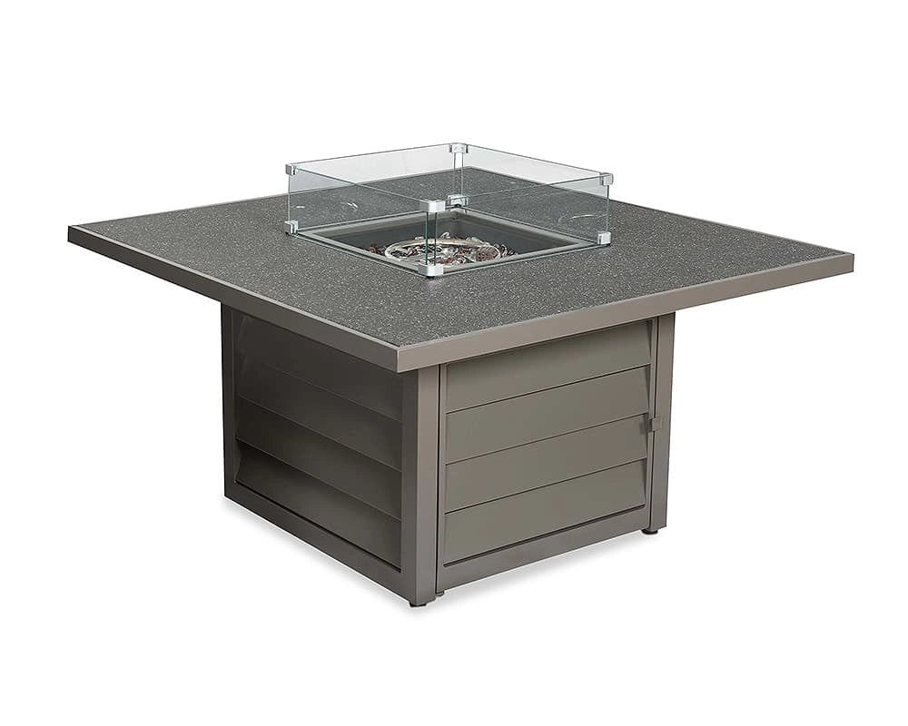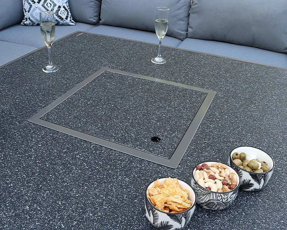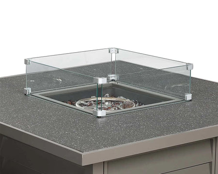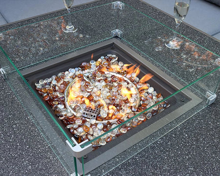 Crafted with a robust metal frame, the Mayfair table is built to last. The sleek grey surface not only adds a modern touch but also provides a practical space for your outdoor essentials. The central fire pit is encased in a glass top, ensuring safety while allowing you to enjoy the mesmerizing flames. This combination of high-quality materials and thoughtful design guarantees a product that will withstand the test of time.