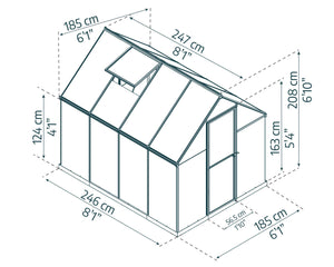 - Dimensions: Width: 185 cm (6 ft 1 in), Depth: 247 cm (8 ft 1 in), Height: 208 cm (6 ft 10 in), Eaves Height: 127 cm (4 ft 2 in)