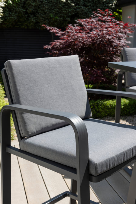 Crafted from robust powder-coated aluminium, this set is built to withstand the elements while maintaining its stylish appearance. The high table features a stable base, ensuring it remains steady even during lively gatherings. The accompanying chairs are designed with comfort in mind, featuring curved armrests and thick, cushioned seats that invite you to sit back and relax. With weather-resistant materials, you can trust that this set will look pristine for years to come.