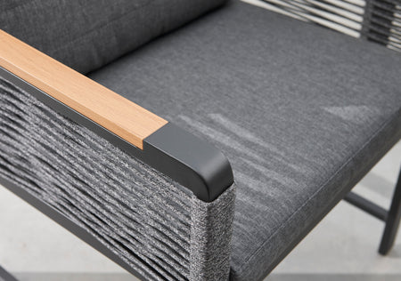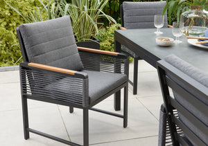 Crafted with a robust black aluminium frame, this dining set is built to withstand the elements while maintaining its sleek appearance. The charcoal ceramic glass table top not only adds a touch of elegance but is also incredibly easy to clean, making post-meal tidying a breeze. The chairs feature a stylish rope weave that enhances comfort and visual appeal, while the shower-resistant grey cushions provide an extra layer of coziness, ensuring you and your guests can relax in comfort.