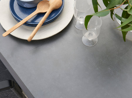 | Materials | Black Aluminium Frame, Charcoal Ceramic Glass Top, Grey Cushions |