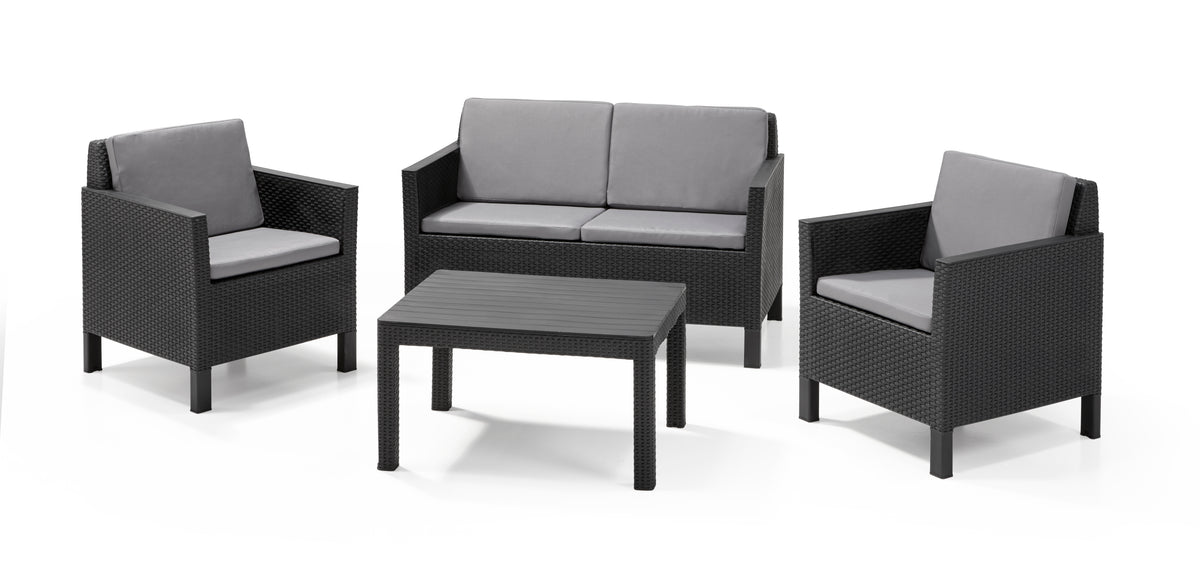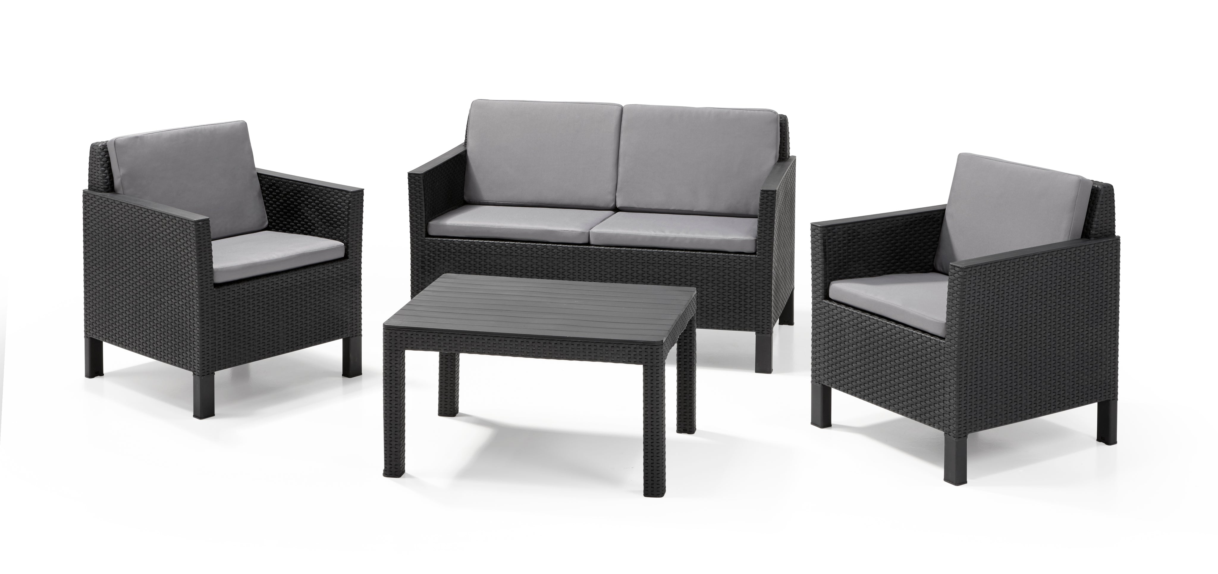 The classic appearance of the Chicago lounge set is all thanks to its smart design. The well-formed armrests of the armchairs and sofa with matching cushions give you everything you need for a comfortable time outdoors.