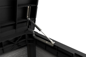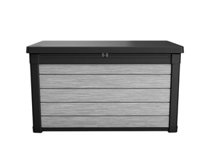 The Norfolk Leisure Denali 380L Garden Storage Box is a 380 litre, heavy duty deck box in a neutral anthracite & grey, which can double up as a seat. It is made from strong, moulded Duotech resin which is weather-resistant & UV protected with a rustic wood-like texture that can be painted if desired. The box is completely water tight but still allows for ventilation to keep items dry; it has a piston system that opens and closes the lid in a smooth motion & has a catch for a lock to keep your items secure.