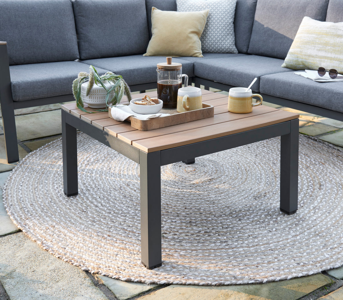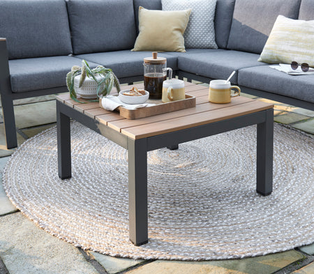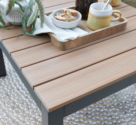 Crafted with quality in mind, the lounge set boasts a lightweight yet sturdy construction, ensuring longevity and ease of movement. The weather-resistant cushions are not only thick and plush for ultimate comfort but also come with removable covers for hassle-free cleaning. The stylish teak look polywood tabletop adds an elegant touch, providing a practical surface for drinks and snacks while resisting the wear and tear of outdoor conditions.