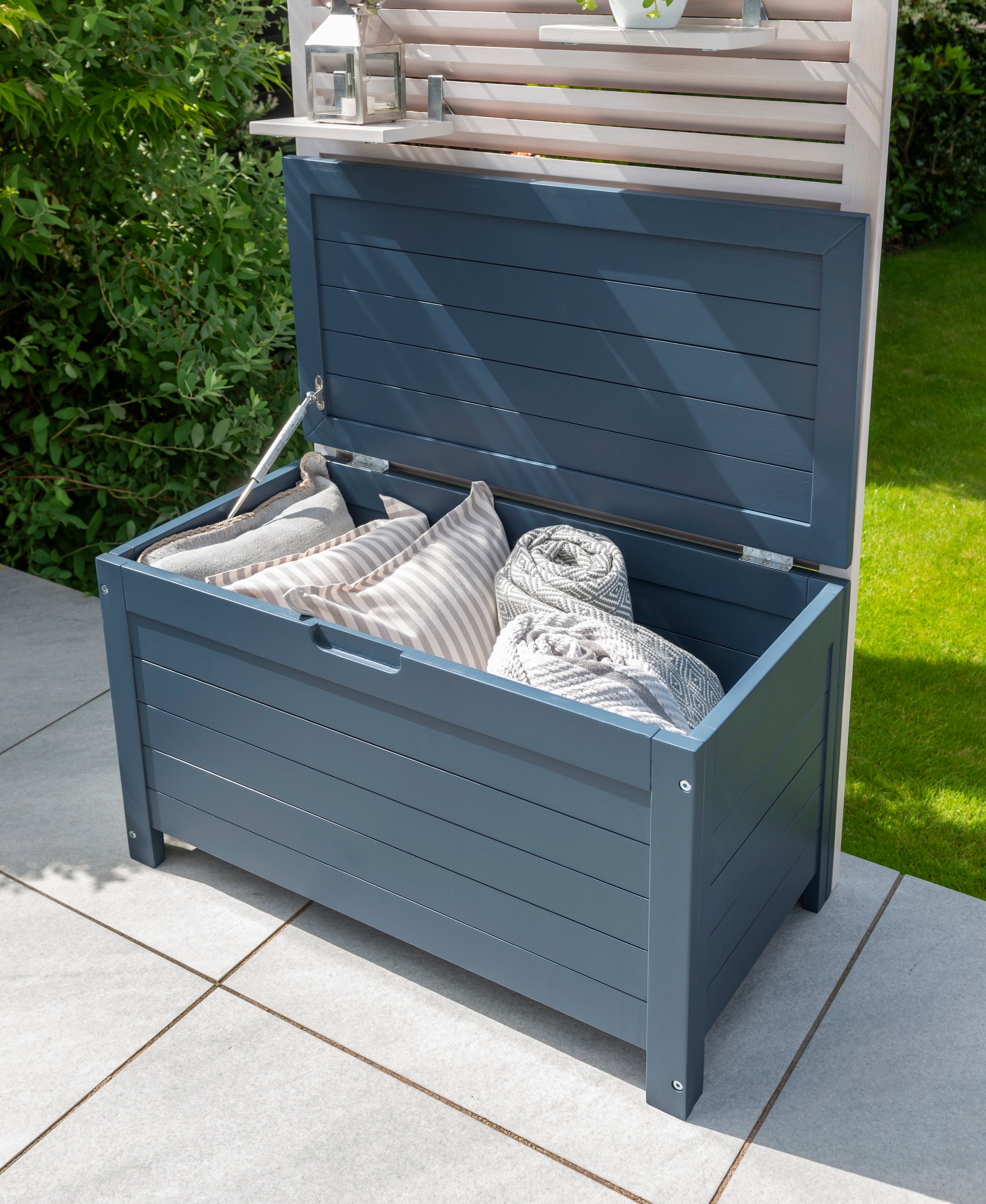 Crafted from durable, weather-resistant FSC 100% Eucalyptus wood, this storage box is built to withstand the unpredictable British weather. The robust rectangular design features a hydraulic lid support, allowing for effortless opening and closing, while the slatted structure promotes ventilation, ensuring your stored items remain dry and fresh. The deep, rich finish not only enhances its aesthetic appeal but also provides a protective layer against moisture and UV rays, ensuring longevity and durability.