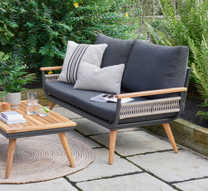 Crafted with a durable powder-coated aluminium frame and FSC Acacia wood accents, the Kimora set is built to withstand the elements while maintaining its sleek aesthetic. The unique rope inset detailing adds a touch of sophistication, making it a standout piece in any garden setting. With its natural finish, the wooden components highlight the beautiful grain and texture, bringing warmth and charm to your outdoor space.