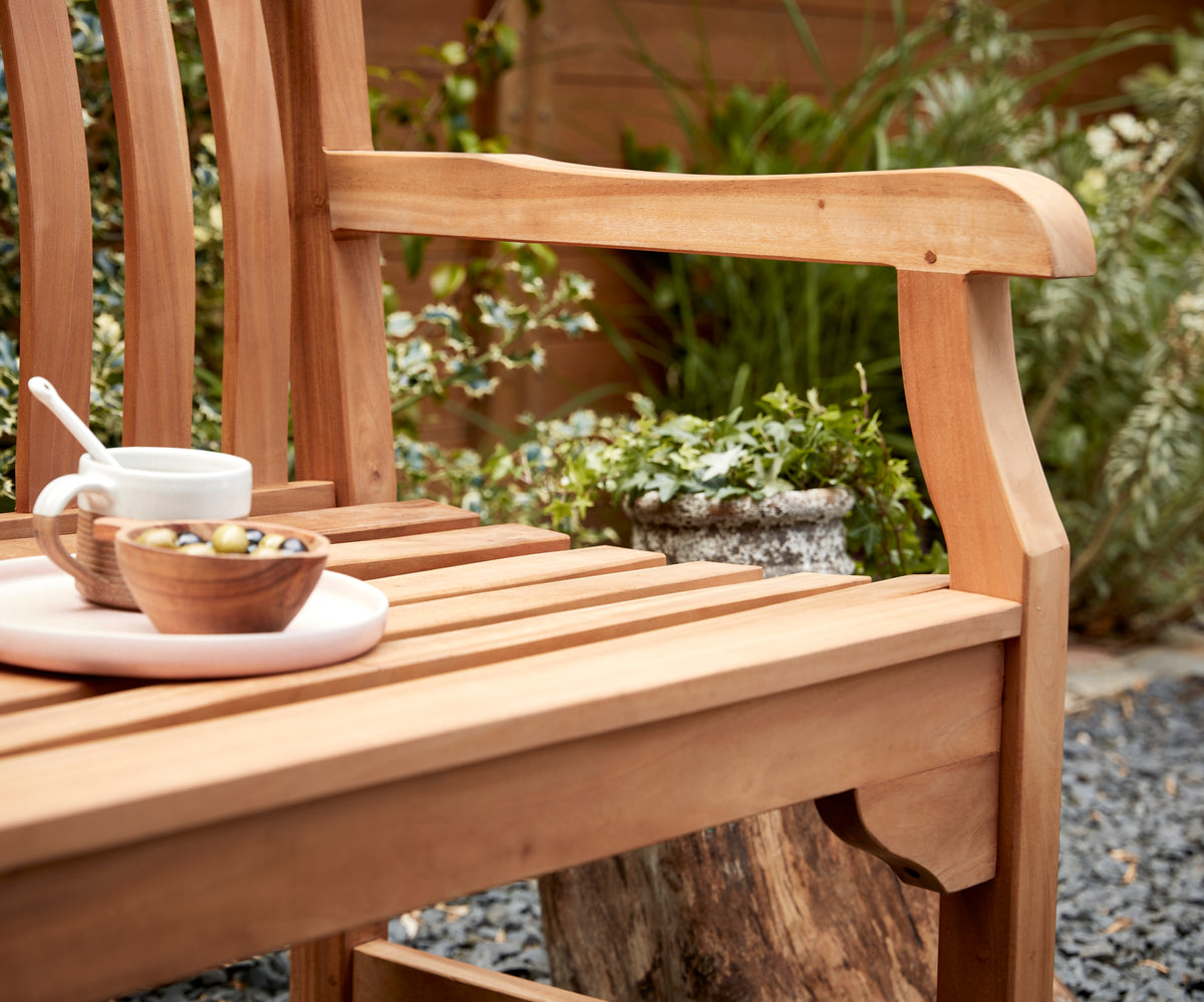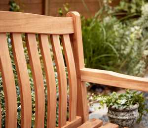 The Norfolk Collection Kingsbury 150 Bench KD Teak, epitomizes timeless elegance in a traditional design. The curved backrest, deep seating, and proportional armrests ensure a comfortable three-seat haven