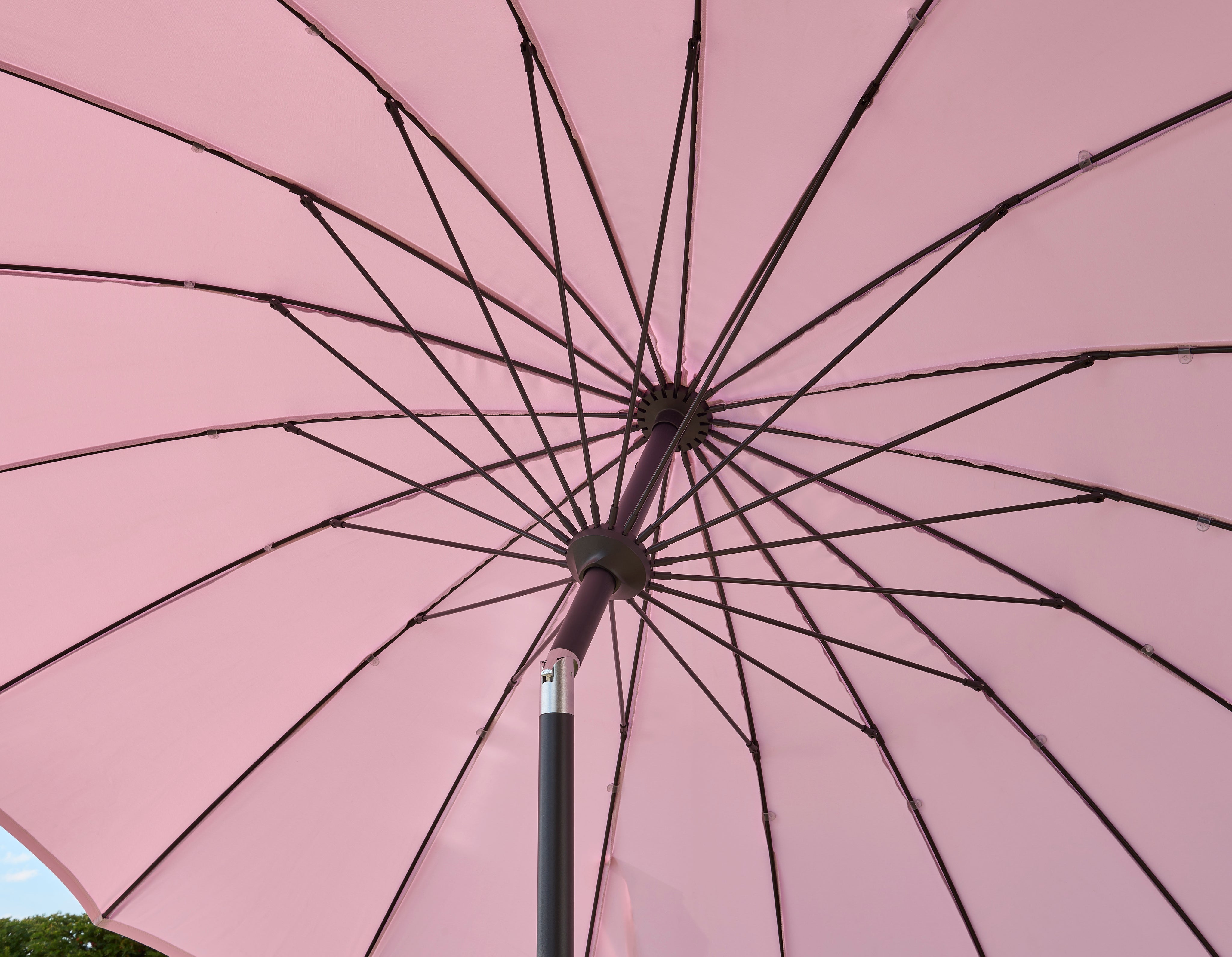 Crafted with a robust aluminium frame, this parasol is built to withstand the elements while maintaining its stylish appearance. The high-quality polyester canopy is not only weather-resistant but also UV-protected, ensuring that it retains its vibrant pink hue season after season. The user-friendly crank handle allows for effortless raising and lowering, while the push-button tilt mechanism lets you adjust the canopy to block sunlight from any angle. Plus, the included night cover provides added protection when the parasol is not in use, prolonging its lifespan.