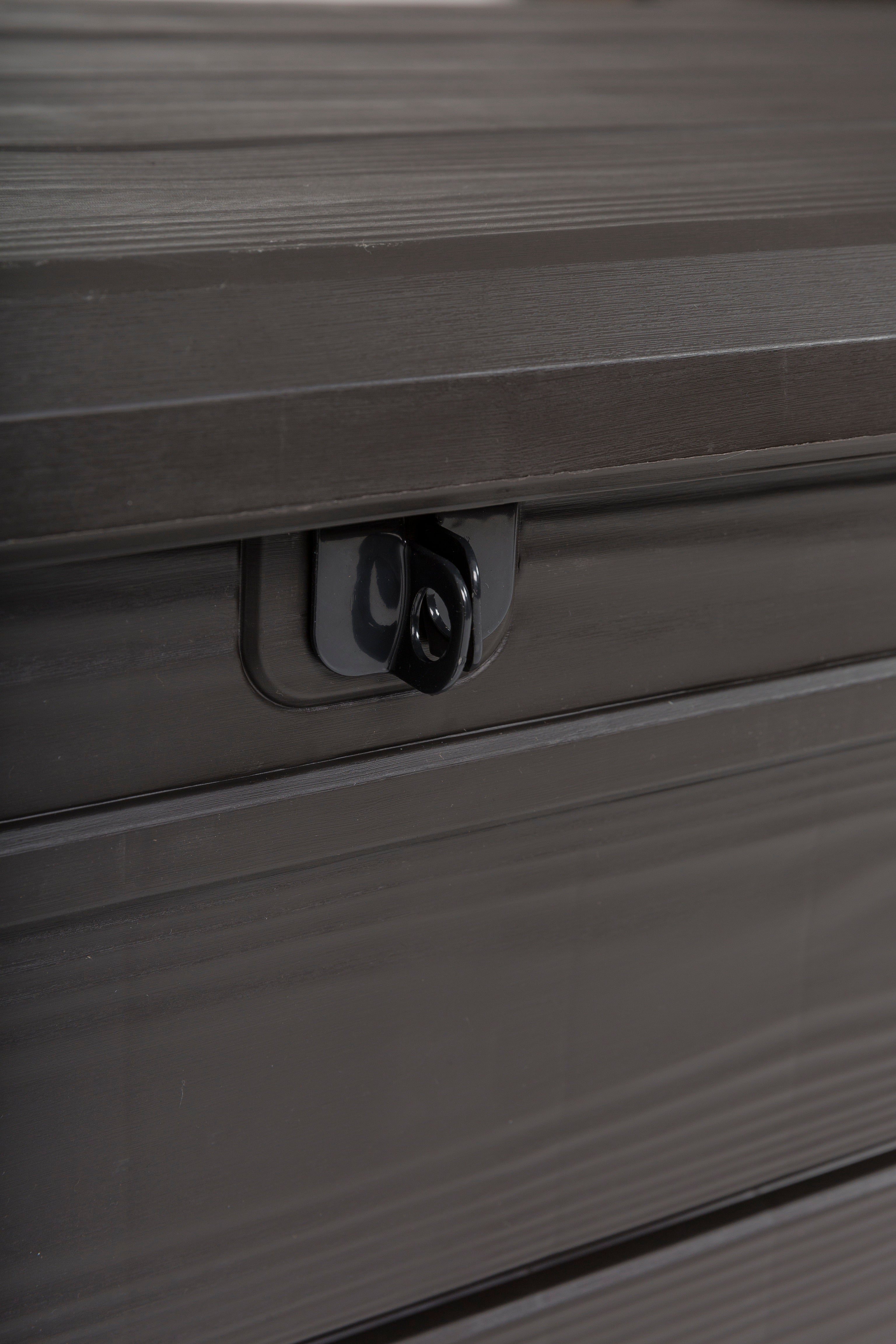 Crafted from durable moulded resin, this storage box boasts a stunning wood-like finish that enhances its aesthetic appeal while providing exceptional strength and weather resistance. The hinged lid opens effortlessly thanks to built-in pistons, making access to your items quick and easy. Plus, the lockable feature adds an extra layer of security, ensuring your belongings are protected from theft or unwanted access.