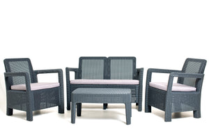 Curved back rests and comfortable seat pads allow you to relax and unwind in your outdoor space. With the addition of a convenient Coffee Table to relax with a drink or to rest your feet.