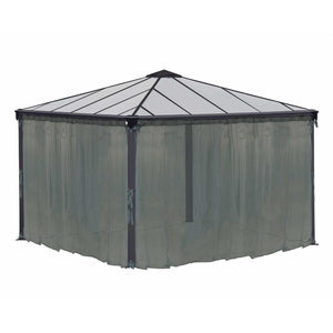 Palram Garden Gazebo Netting Set is aesthetically appealing and functional; it gives you the privacy you look for and cherish. The lightweight polyester comes with hooks that slide into the clips at the track line of your Dallas Gazebo. This Curtain Set was specifically designed to ensure compatibility with the Dallas Garden Gazebo. One package includes a set of four curtains to cover your entire Dallas Gazebo; Easy to install and easy to use. Includes zipper to connect the screens together and ties to pull the screens to the corner posts. Made of strong polyester, waterproof and lightweight Panels zip together for total privacy or un-zip to let just the right amount of light/privacy Colour: Grey All hardware included Easy to install instruction manual Includes top, middle & bottom corner post tie backs to keep curtains open UV resistant Machine wash cold. No chlorine bleach. Line dryDelivery: