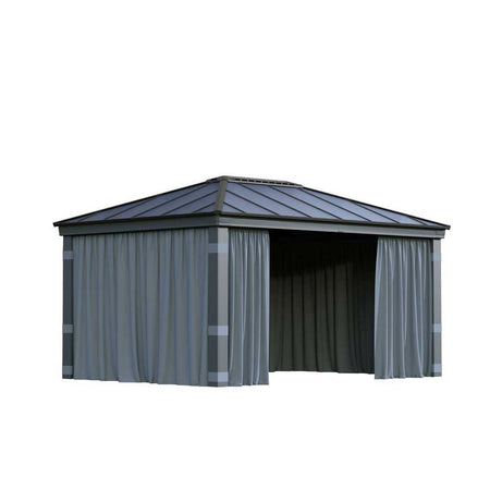 Palram Garden Gazebo Curtain Set is aesthetically appealing and functional; it gives you the privacy you look for and cherish.Β The lightweight polyester curtain comes with hooks that slide into the clips at the track line of your Dallas Gazebo. This Curtain Set was specifically designed to ensure compatibility with the Dallas Garden Gazebo. One package includes a set of four curtains to cover your entire Dallas Gazebo; Easy to install and easy to use. Includes zipper to connect the screens together and ties to pull the screens to the corner posts. Made of strong polyester, waterproof and lightweight Panels zip together for total privacy or un-zip to let just the right amount of light/privacyΒ Colour: Grey All hardware included Easy to install instruction manual Includes top, middle & bottom corner post tie backs to keep curtains open UV resistant Machine wash cold. No chlorine bleach. Line dry