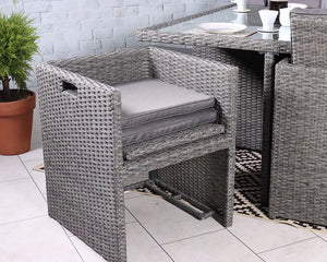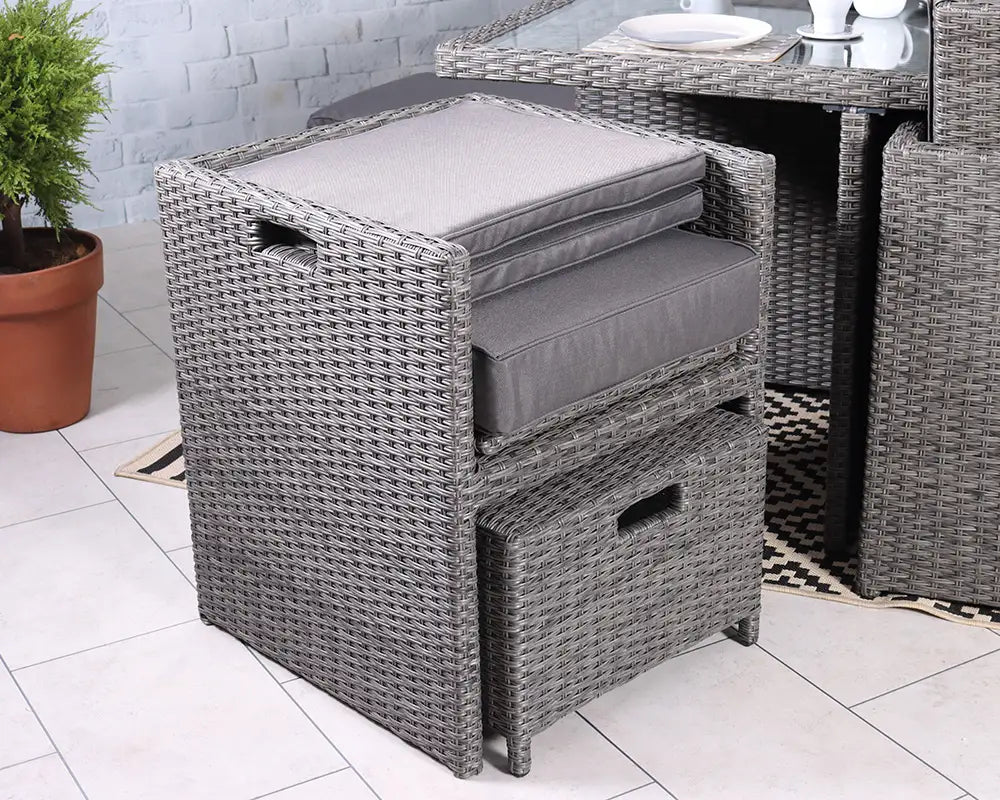 Crafted from high-quality rattan, this dining set boasts exceptional durability and weather resistance, ensuring it withstands the elements while maintaining its stylish appearance. The robust aluminium frame provides stability, while the tempered glass tabletop adds a touch of sophistication. Each cube chair and integral stool is equipped with soft cushions, offering comfort for extended gatherings.