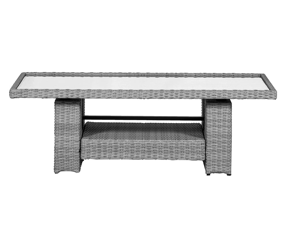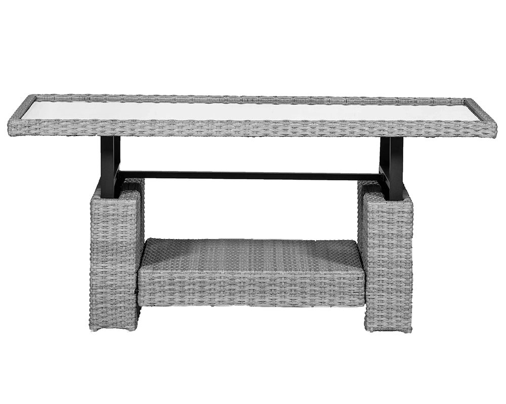 Crafted with quality in mind, this set features a robust metal frame wrapped in a stylish grey rattan weave, ensuring both durability and aesthetic appeal. The adjustable height table is a standout feature, allowing you to easily switch between dining and casual coffee moments. The cushions are upholstered in weather-resistant fabric, providing comfort and style that withstands the elements.