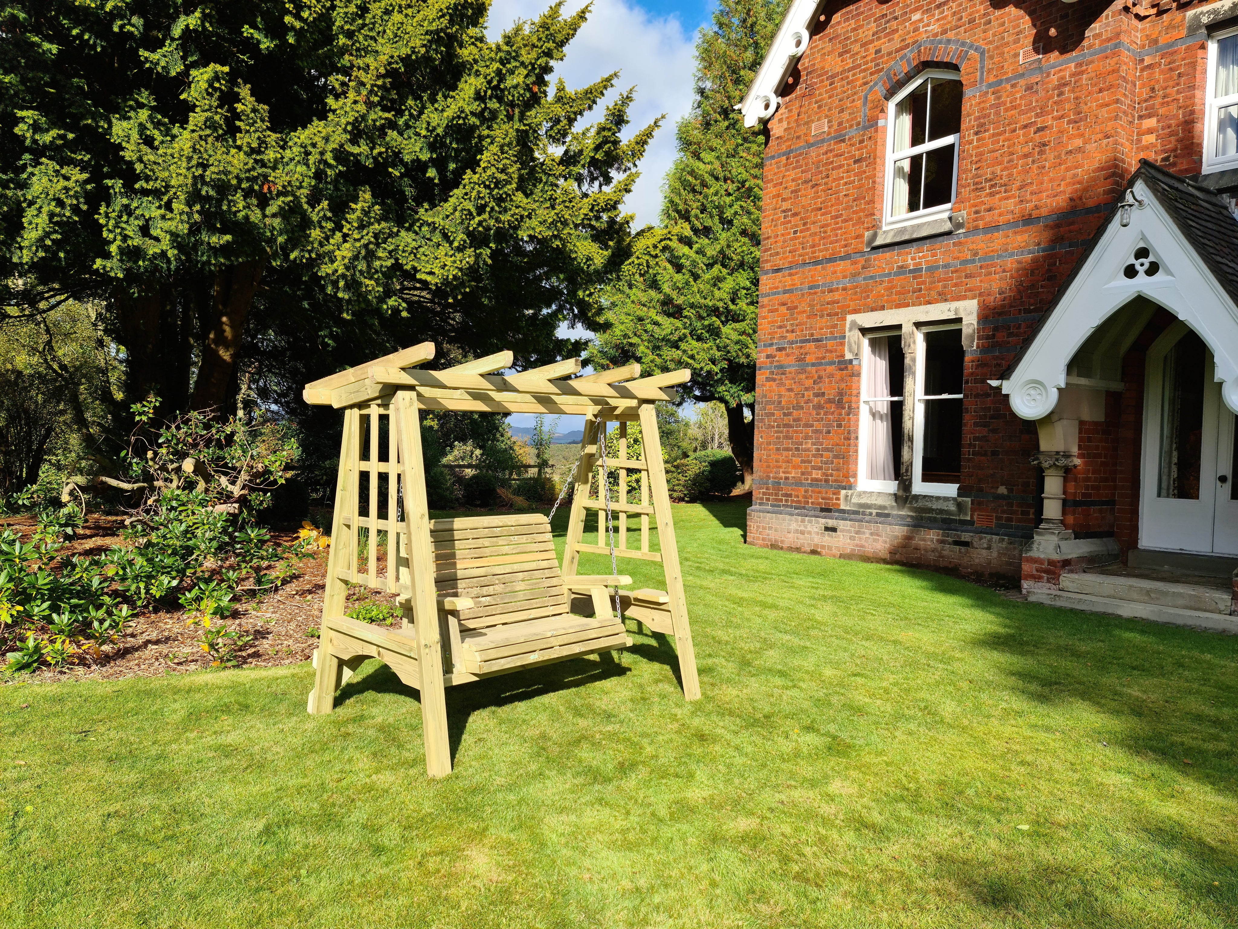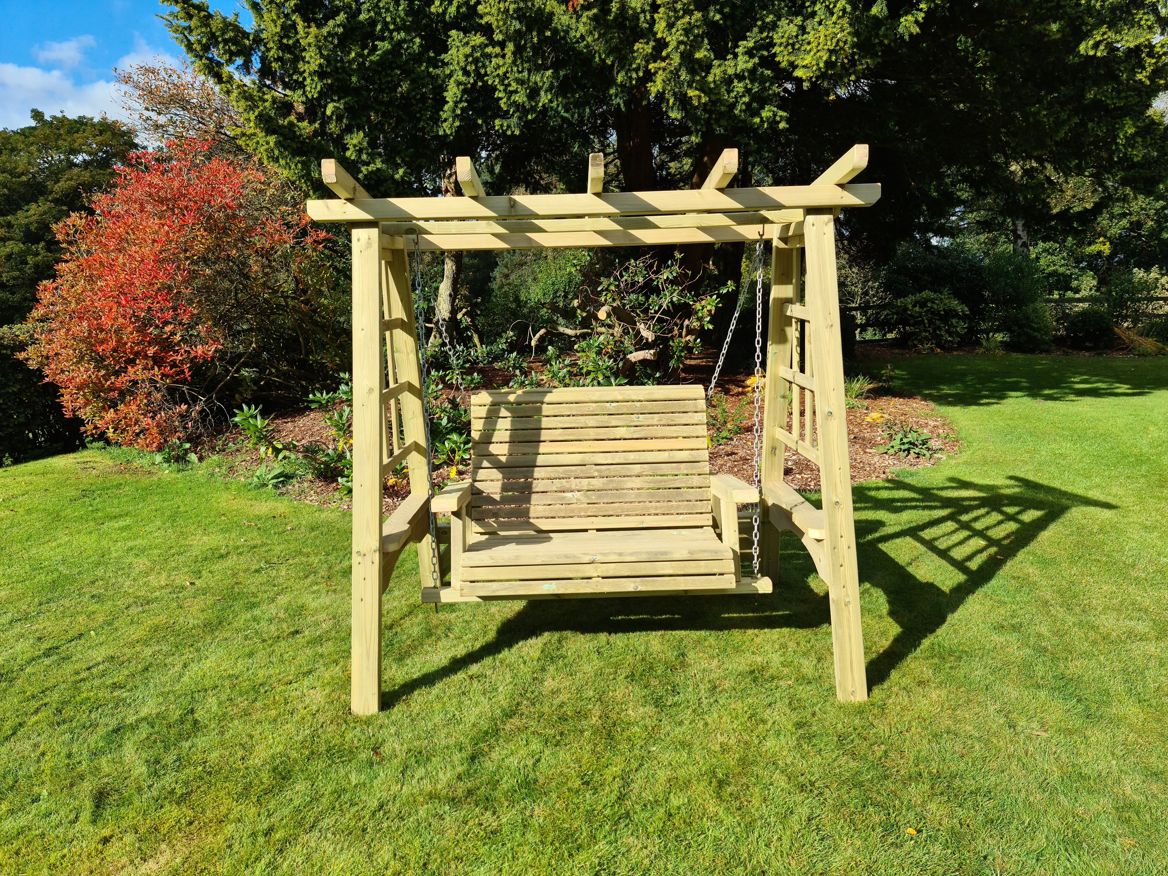 Constructed from premium quality, pressure-treated timber, this swing seat is built to withstand the elements and resist rot for up to 20 years. The chunky wooden slats provide a solid seating area, while the pergola overhead not only adds a touch of elegance but also offers partial shade on sunny days. Handmade in the UK, each swing seat is crafted with care, ensuring that you receive a product of the highest quality that will last for years to come.