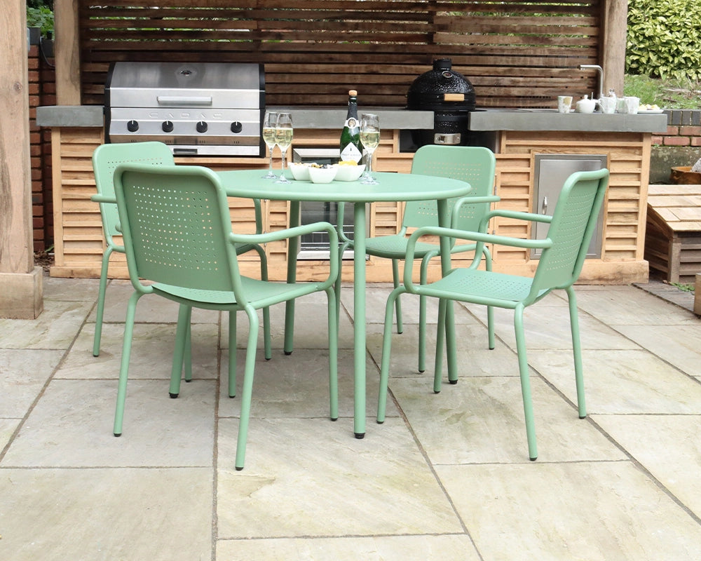 Porto 4 Seater Metal Garden Dining Set with Round 100cm Table & Stacking Chairs - Olive - This stunning dining set is designed for those who love to entertain outdoors. With a generous 100cm round table, it comfortably seats four, making it ideal for everything from casual family dinners to lively summer barbecues. The inviting olive hue adds a touch of nature, seamlessly blending with your garden's greenery.