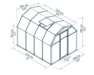 - Dimensions: 6ft (Length) x 8ft (Width) | Total Height: 198cm (6ft 6ins) | Eaves Height: 124cm (4ft)