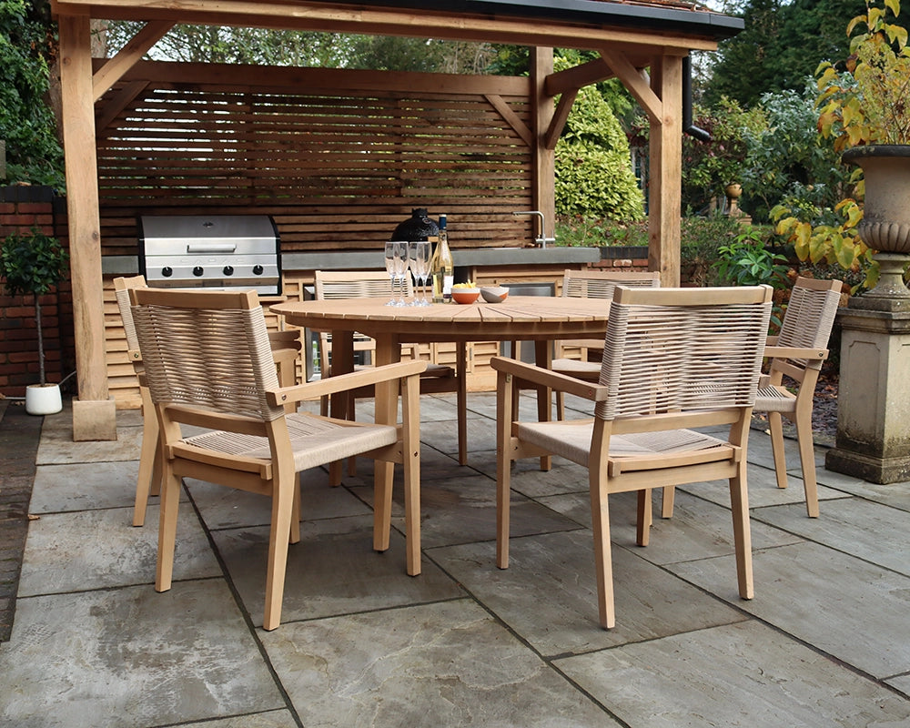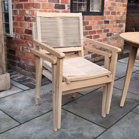 Crafted from high-quality, sustainably sourced Acacia hardwood, this dining set is not only beautiful but also built to last. The table features a smooth, sunray-patterned surface that adds a touch of elegance, while the chairs are adorned with durable rope detailing that enhances both comfort and style. The weather-resistant treatment ensures that your furniture remains stunning through all seasons.