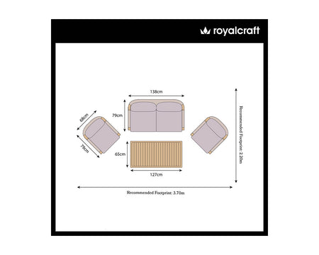 | Dimensions | Table: H: 36cm x W: 127cm x L: 65cm Armchair: H: 70cm x W: 69cm x L: 80cm Double Sofa: H: 70cm x W: 138cm x L: 79cm |