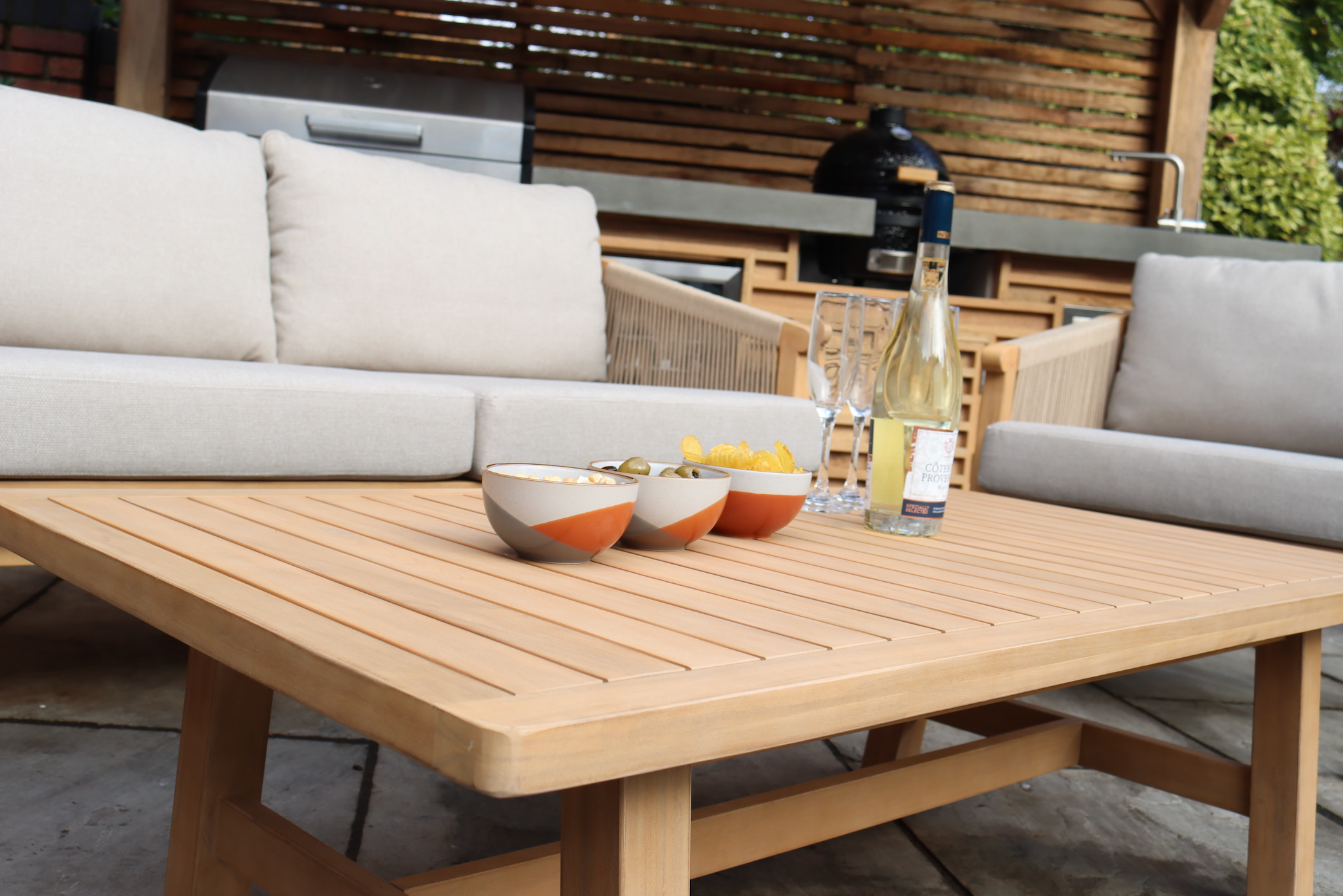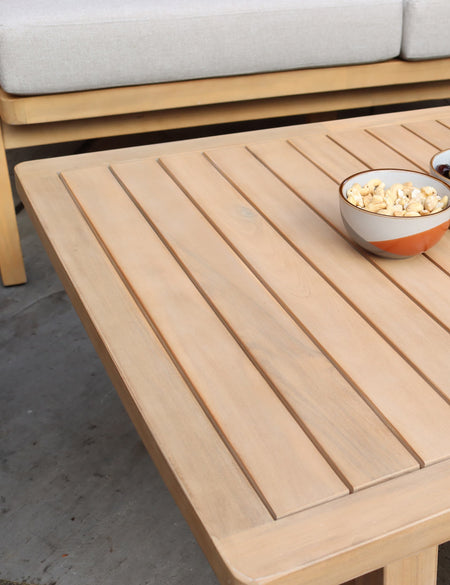 | Construction Details | Solid frame with plush cushions and slatted coffee table |