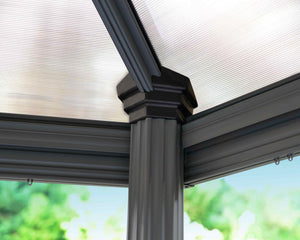 Crafted from high-quality aluminium, the Roma Gazebo is built to last. Its rust-resistant frame ensures durability against the elements, while the 6 mm twin-wall polycarbonate roof panels offer high-impact resistance and UV protection. The sloped roof design allows for efficient water drainage, preventing debris accumulation and ensuring a clean, stylish look year-round.