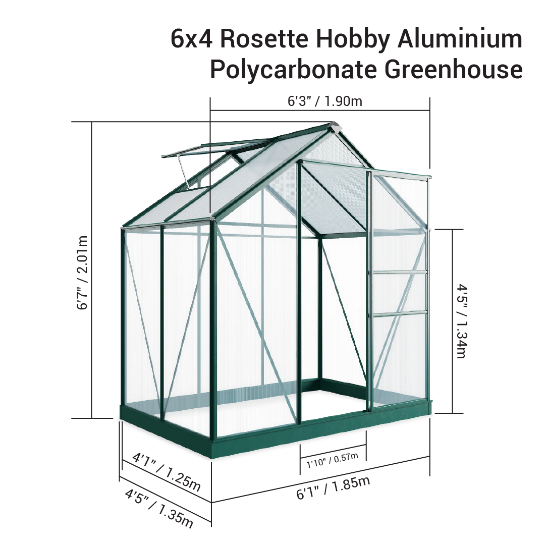 The Rosette Hobby Aluminium Polycarbonate Greenhouse 6x4 is perfect for hobby gardeners, urban dwellers with limited space, or anyone looking to enhance their gardening experience. With its user-friendly design and durable construction, itβs an excellent choice for both novice and experienced gardeners alike. Why buy from our website? We pride ourselves on exceptional customer service, offering free delivery across the UK and a satisfaction guarantee. Join our community of happy gardeners and elevate your gardening game today!