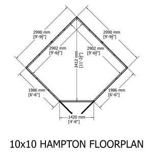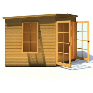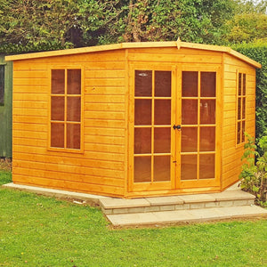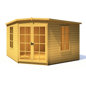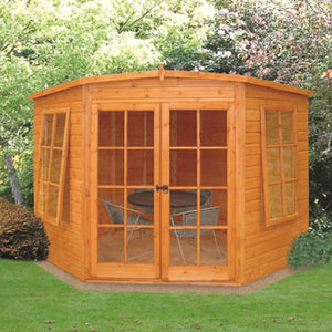 The Shire Hampton Summerhouse would make a stylish addition to any garden. Designed to be placed into a corner, with all of the outward facing walls being glazed or part glazed to allow maximum daylight to flood into the building. The double doors and the flanking windows are glazed in the Georgian style, with many small square windows. The Hampton Summerhouse is made from tongue and groove cladding to the walls and floor. The roof panels are solid sheet boarding. Mineralized felt is supplied to cover the roof and full instructions, fixtures and fittings are provided as standard. While it is designed for placement in the corner of a garden, we recommend allowing a little room all around this corner summerhouse to make it easier to re-apply wood preservative as instructed.