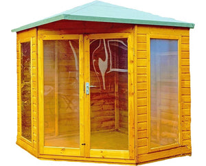 The Larkspur is a magnificent corner summer house designed to transform your garden and provide maximum enjoyment. With its full height, styrene safety glazed windows and doors, this summerhouse lets in lots of light and is a delight to spend your time in. The summerhouse has a basecoat ready for you to topcoat. Whether it's stained or painted it will certainly enhance its beautiful design. The double doors are lockable and the two side windows are fixed. This garden room is manufactured from high quality FSC certified northern European pine. The floor, roof and walls are tongued and grooved timber ; green mineral roof felt is included. Allowance should be made for the roof overhang and access for painting and during installation. Imperial dimensions are rounded and for guidance only.