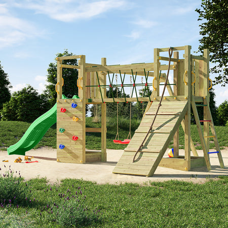 The Shire Maxi Fun Climbing Wall, Rope Bridge with Double Swings & Slide is the ultimate outdoor playset that combines climbing, swinging, and sliding into one exciting package. Perfect for residential backyards, this playset caters to children of various ages, promoting physical activity and social interaction. Itβs not just a playset; itβs a gateway to adventure, encouraging kids to explore their limits and build confidence through active play.