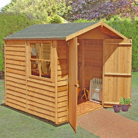 The Shire Overlap Garden Shed 7x7 with Double Doors is part of a range of apex roof sheds made from kiln-dried timber, making them much more resistant to warping. They feature 34x34mm thickness framing that is usually reserved for more expensive tongue and groove buildings. Each of these Overlap sheds have a higher eaves height when compared to the equivalent size, regular overlap buildings allowing more headroom inside the shed. This 7x7 shed also features a quality joinery opening window that can be placed on either side of the building, to best suit the position of the shed in your garden. The glazing is single pane horticultural glass. The roof and floor are formed from a solid sheet boarding, again on a 34x34mm framing. The wall panels are constructed of overlap cladding and supplied in modular sections. The main advantage of a modular design is that each individual panel will be small enough (in one or both dimensions) to be carried by one person and will fit through a standard pedestrian door. As a concequence the individual boards may not line up perfectly with those on adjacent panels, due to the variences in the natural timber cladding. Access is provided by a handy wide double door, complete with a hasp and staple (customer to supply padlock).