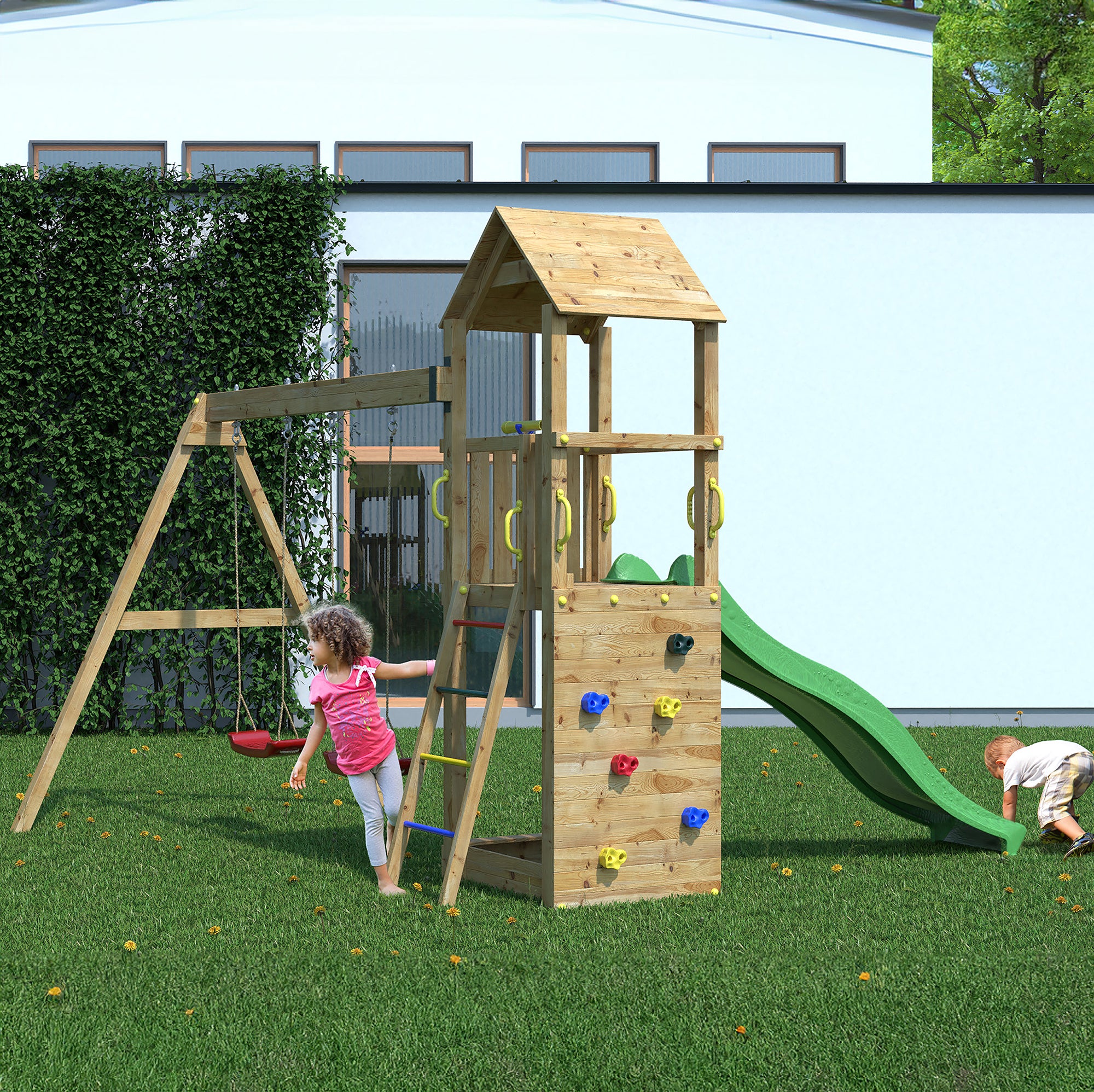 This playset is designed for easy access and maximum enjoyment. The climbing wall features easy-to-grab chunky handles, making it suitable for young adventurers. The spacious layout allows multiple children to play together without feeling cramped, fostering social interaction and teamwork. Installation is straightforward, and with minimal maintenance required, you can spend more time enjoying the fun and less time worrying about upkeep.