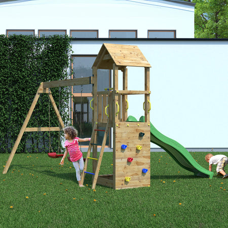 The Shire Sky High Hideout Climbing Wall with Double Swing & Slide is perfect for families looking to enhance their outdoor space with a safe and engaging playset. Ideal for children aged 3 to 10, it encourages physical activity and imaginative play. When you choose Shire, youβre investing in quality and safety, backed by a company with a reputation for excellence in outdoor play equipment. Create lasting memories in your garden with this fantastic playset!