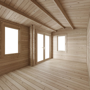 Crafted from robust 44mm interlocking tongue and groove log boards, the Welbeck is built to withstand the unpredictable British weather. The heavy-duty 19mm tongue and groove floor and roof ensure durability, while the protective green mineral felt roofing adds an extra layer of defence against the elements. With a secure mortice lock system, you can rest assured that your belongings are safe. Plus, our commitment to quality means you can enjoy peace of mind with our .