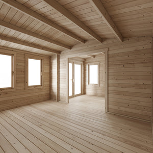 | Construction Details | 44mm interlocking log boards, 19mm tongue-and-groove floor and roof |